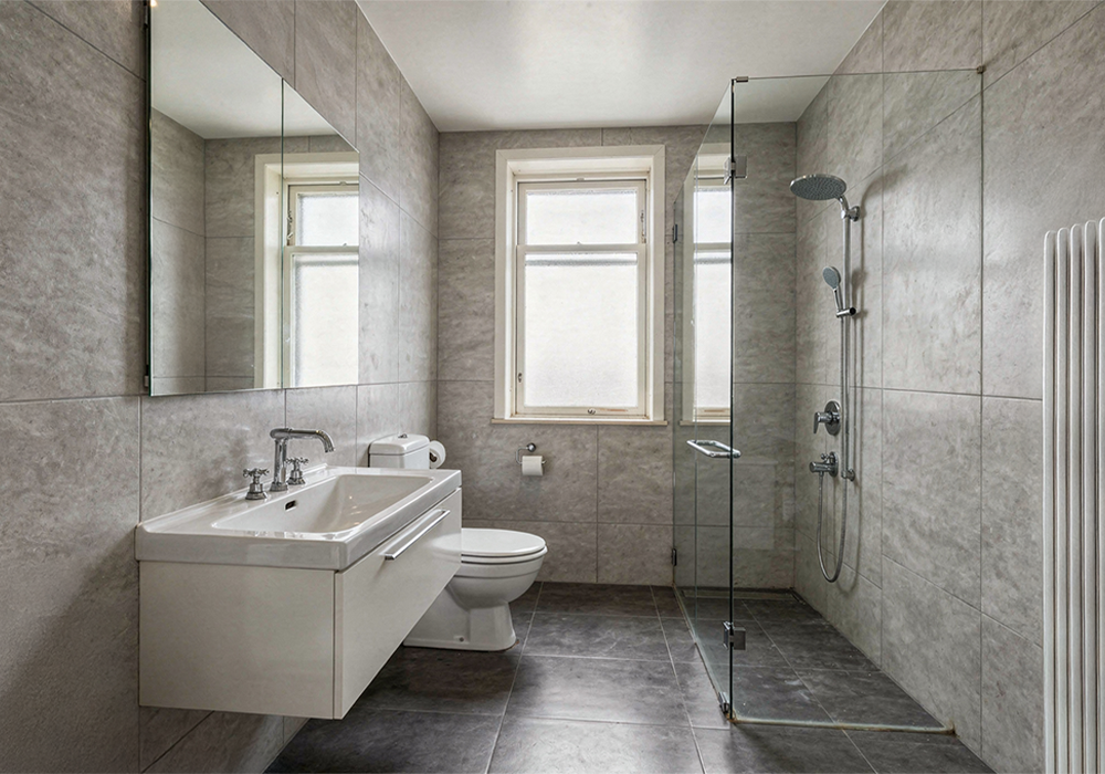 Die Verwandlung zeigt, was durch kluge Planung möglich ist: Die großformatigen Fliesen in Naturstein-Optik lassen den Raum sofort größer und edler wirken. Die gläserne Eckdusche ersetzt die alte, beengte Lösung und sorgt für optische Weite, während der moderne, flache Heizkörper unter dem Fenster dezent Platz spart. Besonders hervorzuheben ist der wandhängende Waschtisch mit integriertem Unterschrank – eine saubere Lösung, die Ordnung schafft und das Bad modern abrundet. Ein Ergebnis, das zeigt: Wir verwandeln Standard-Bäder in echte Unikate.