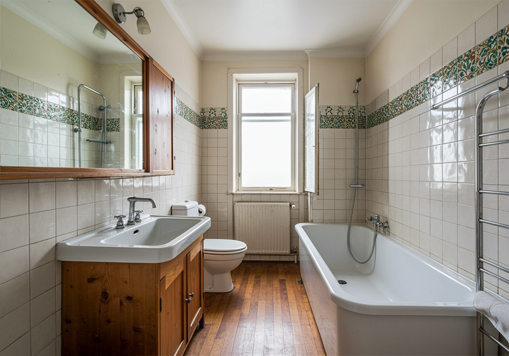 Klassischer Altbau-Charme, der in die Jahre gekommen ist: Ein Holzboden im Nassbereich, gemusterte Bordüren und eine Badewanne, die den Raum beengte. Der wuchtige Spiegelschrank und die alte Beleuchtung ließen das Bad trotz Fenster dunkel und unübersichtlich wirken.